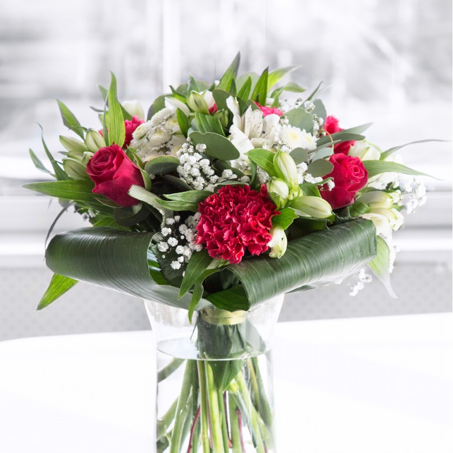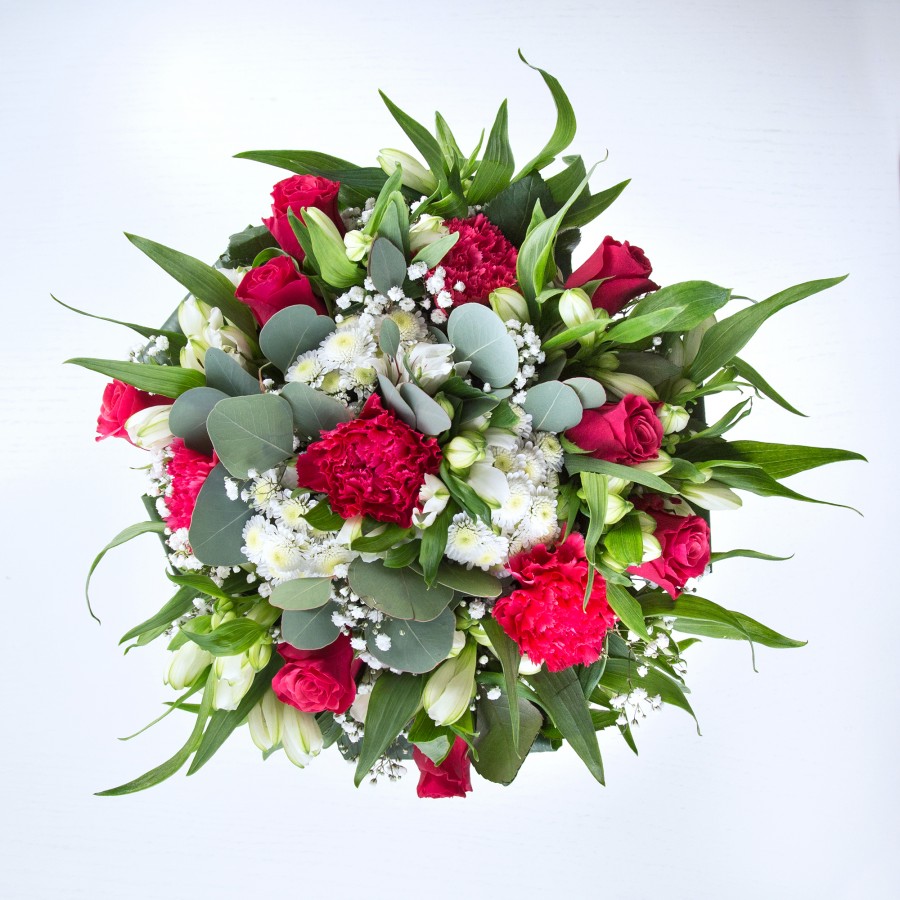 Embrace the timeless beauty of our Timeless Beauty Bouquet. This exquisite arrangement blends rich red roses, pure white chrysanthemums, and delicate gypsophila with white alstroemeria and aspidistra leaves. Each flower is hand-selected for maximum freshness, ensuring a stunning and unique display that makes a perfect luxurious gift.